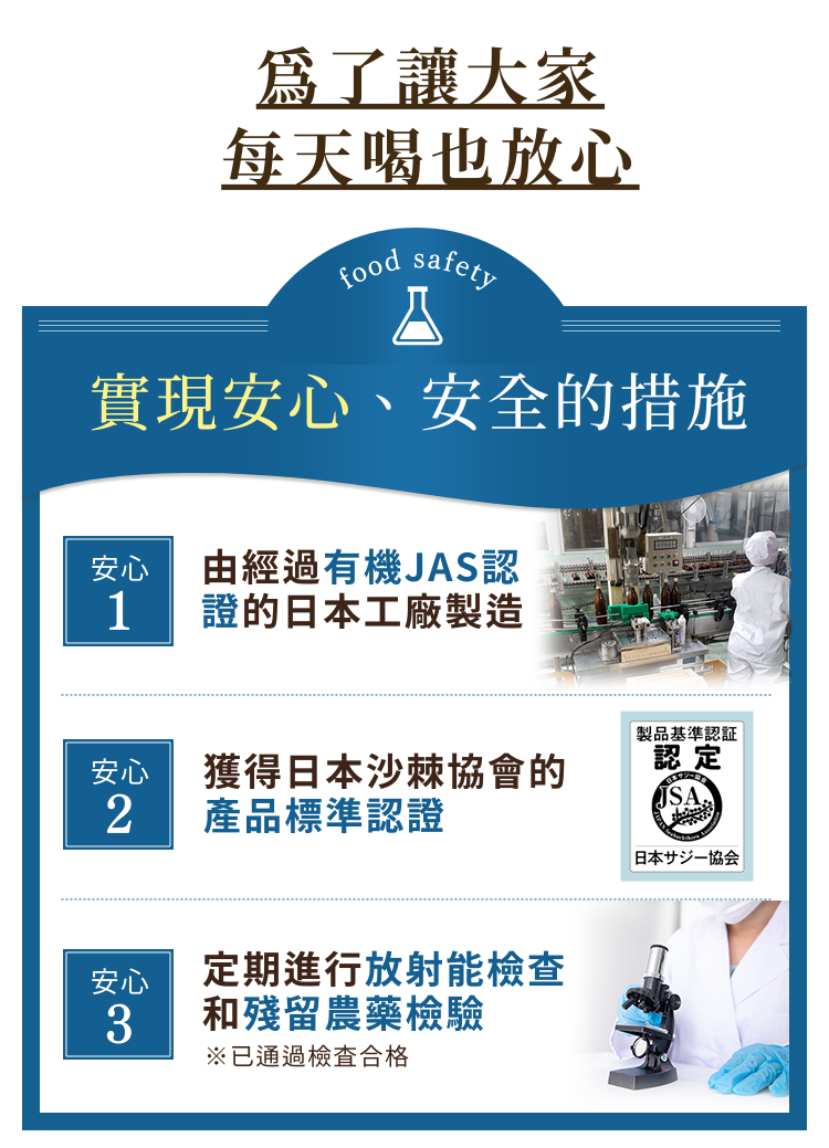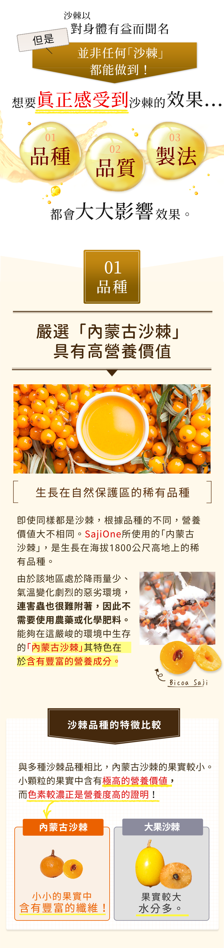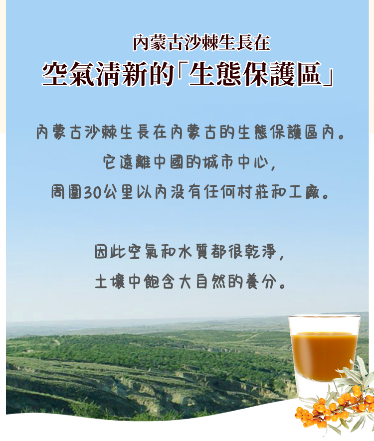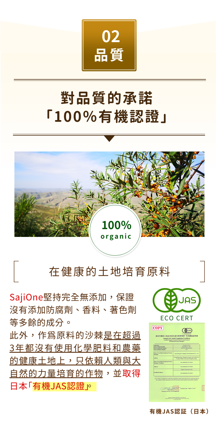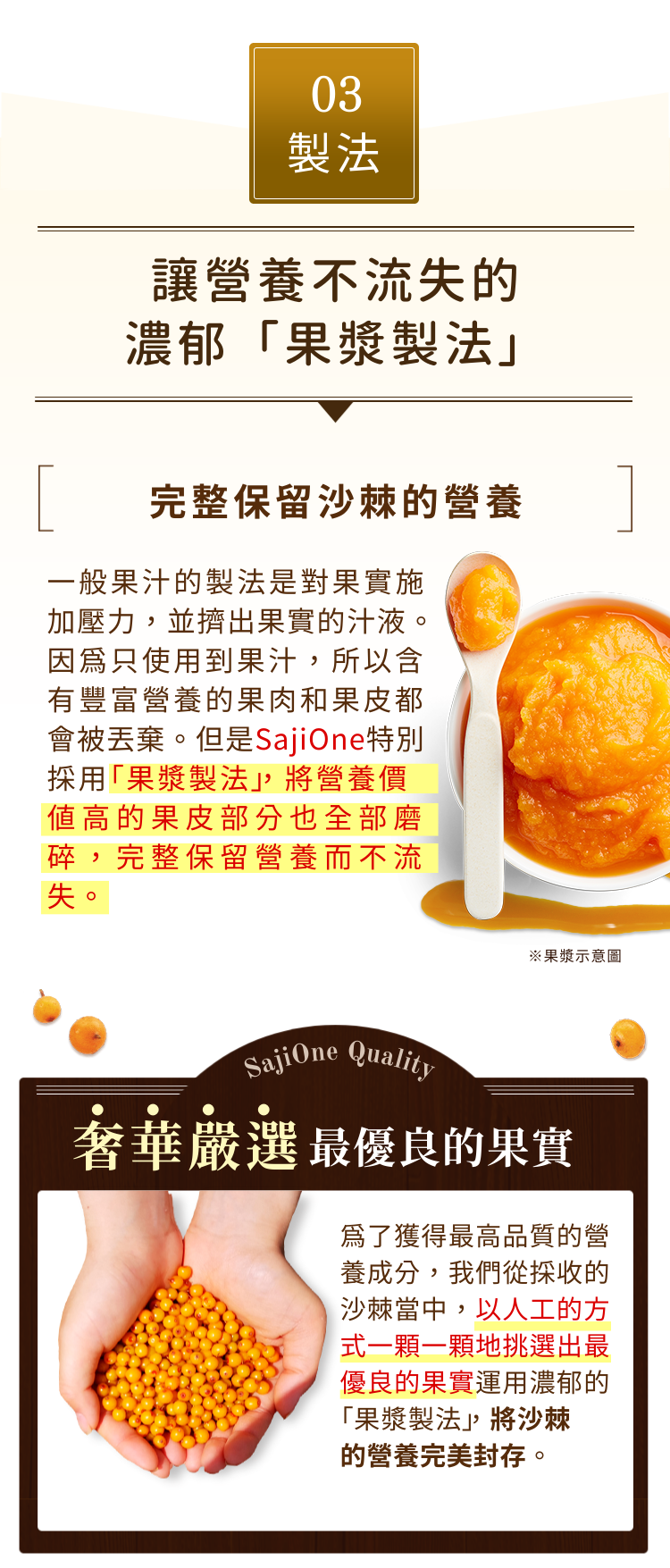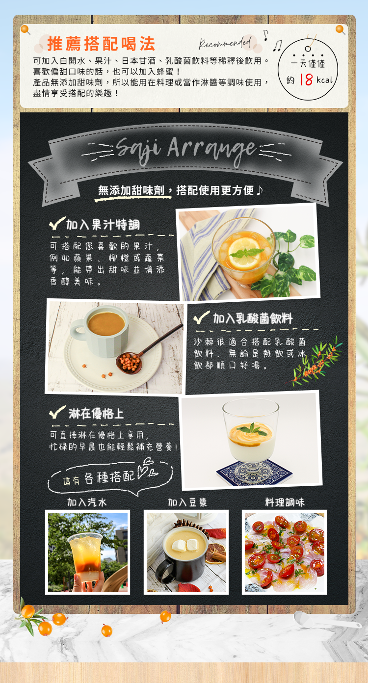 沙棘富含蘋果酸(有機酸),因此具有強烈的酸味和濃郁的口感。SajiOne 是「無添加(※)有機」產品,因此保留了沙棘原有的自然味道。蔬食者和純素食者也可以放心飲用。