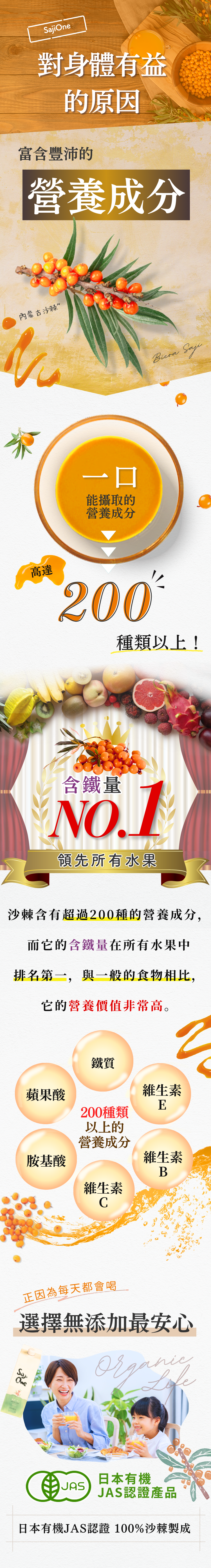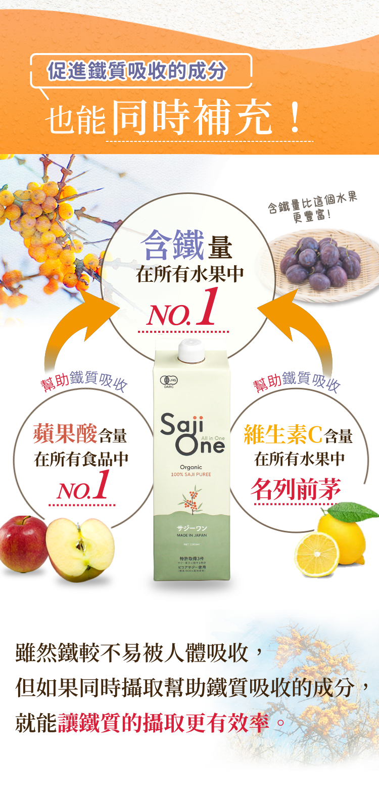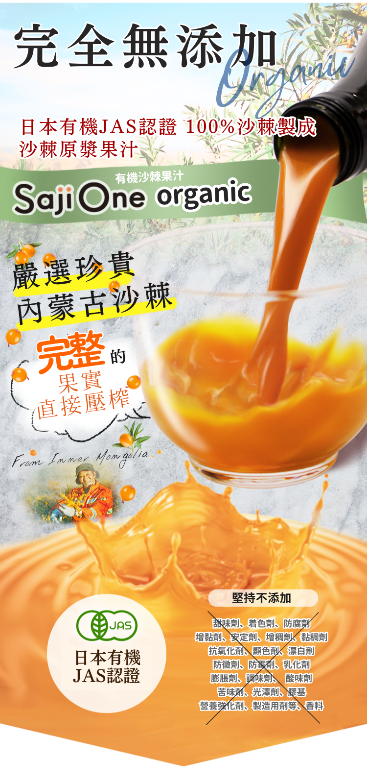 沙棘富含蘋果酸(有機酸),因此具有強烈的酸味和濃郁的口感。SajiOne 是「無添加(※)有機」產品,因此保留了沙棘原有的自然味道。蔬食者和純素食者也可以放心飲用。