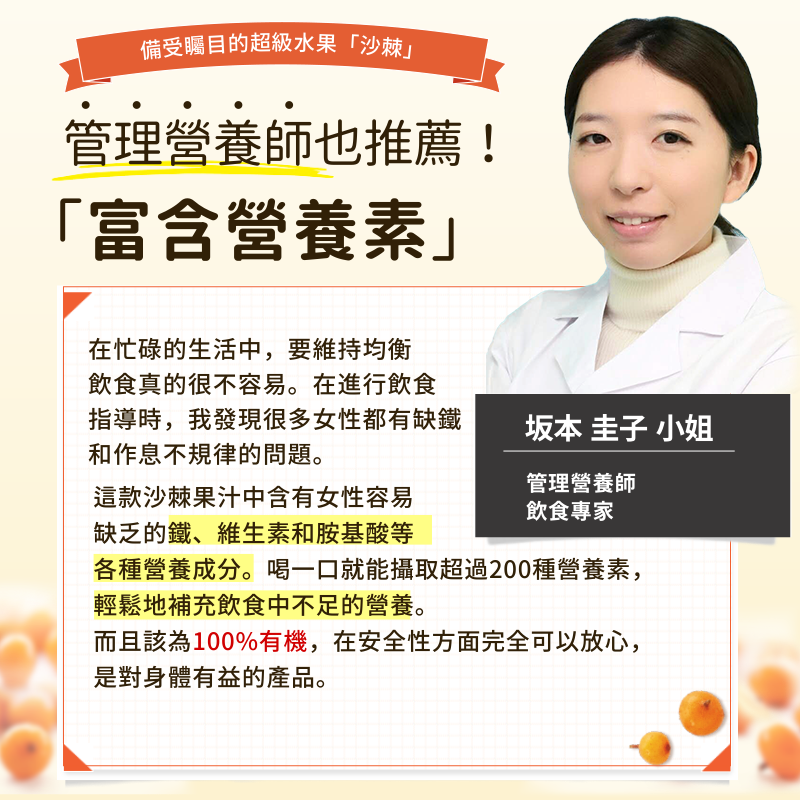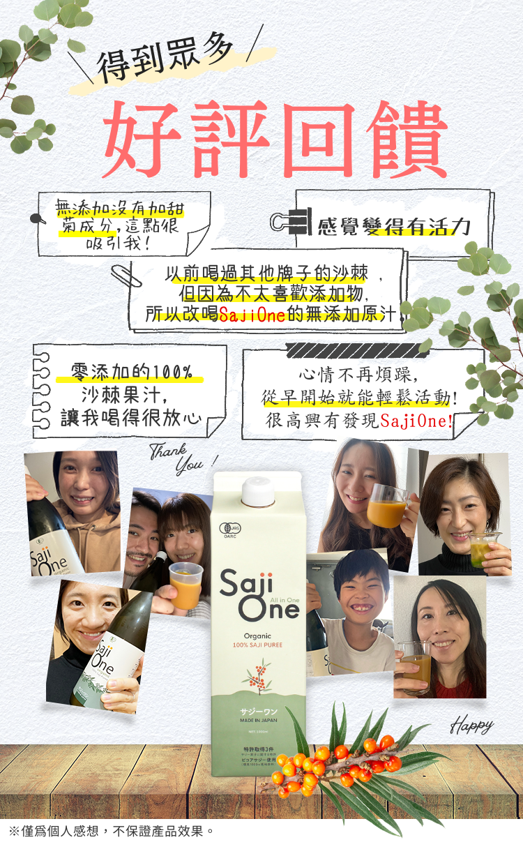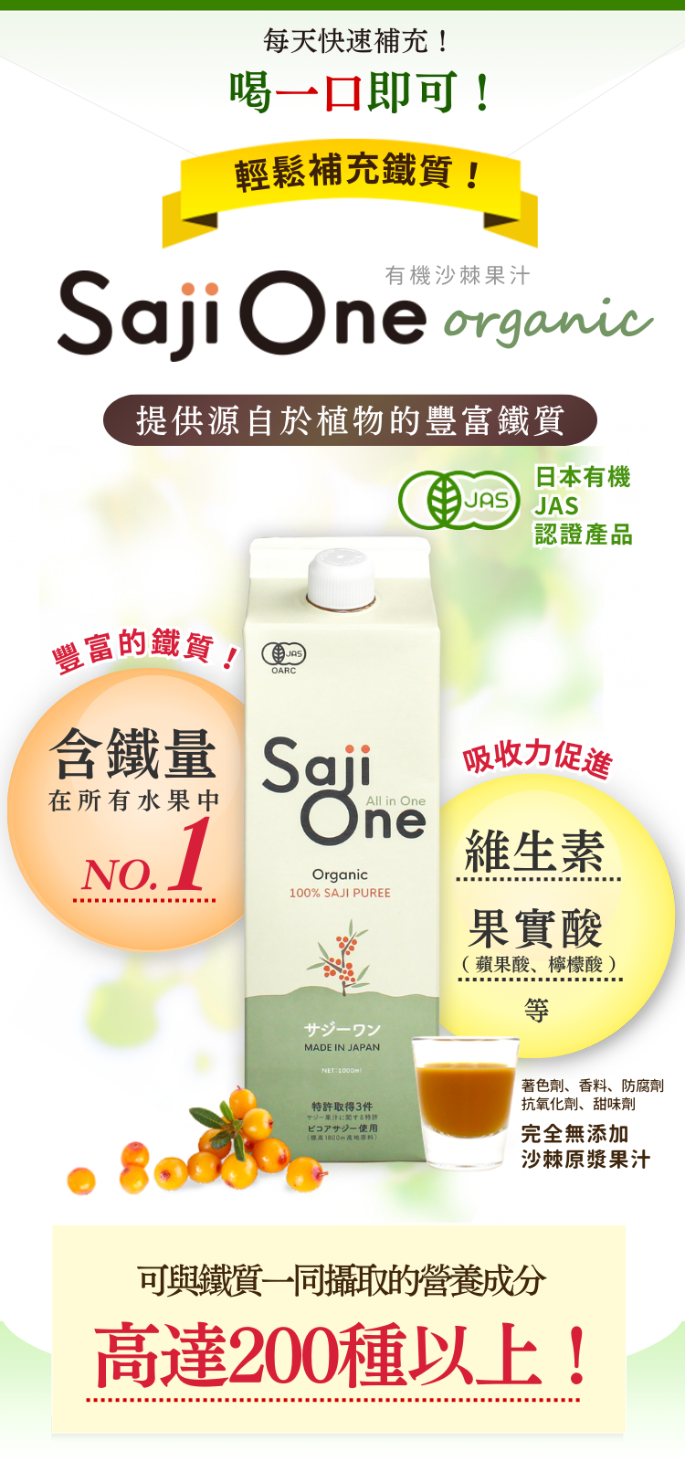 沙棘富含蘋果酸(有機酸),因此具有強烈的酸味和濃郁的口感。SajiOne 是「無添加(※)有機」產品,因此保留了沙棘原有的自然味道。蔬食者和純素食者也可以放心飲用。