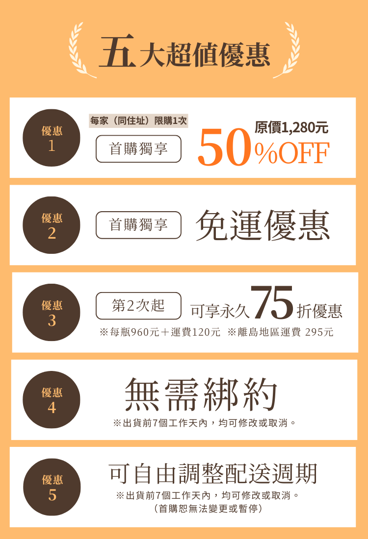 定期配送方案可隨時取消。如您不打算繼續訂購,請於預計出貨日7個工作天前與我們聯繫取消。