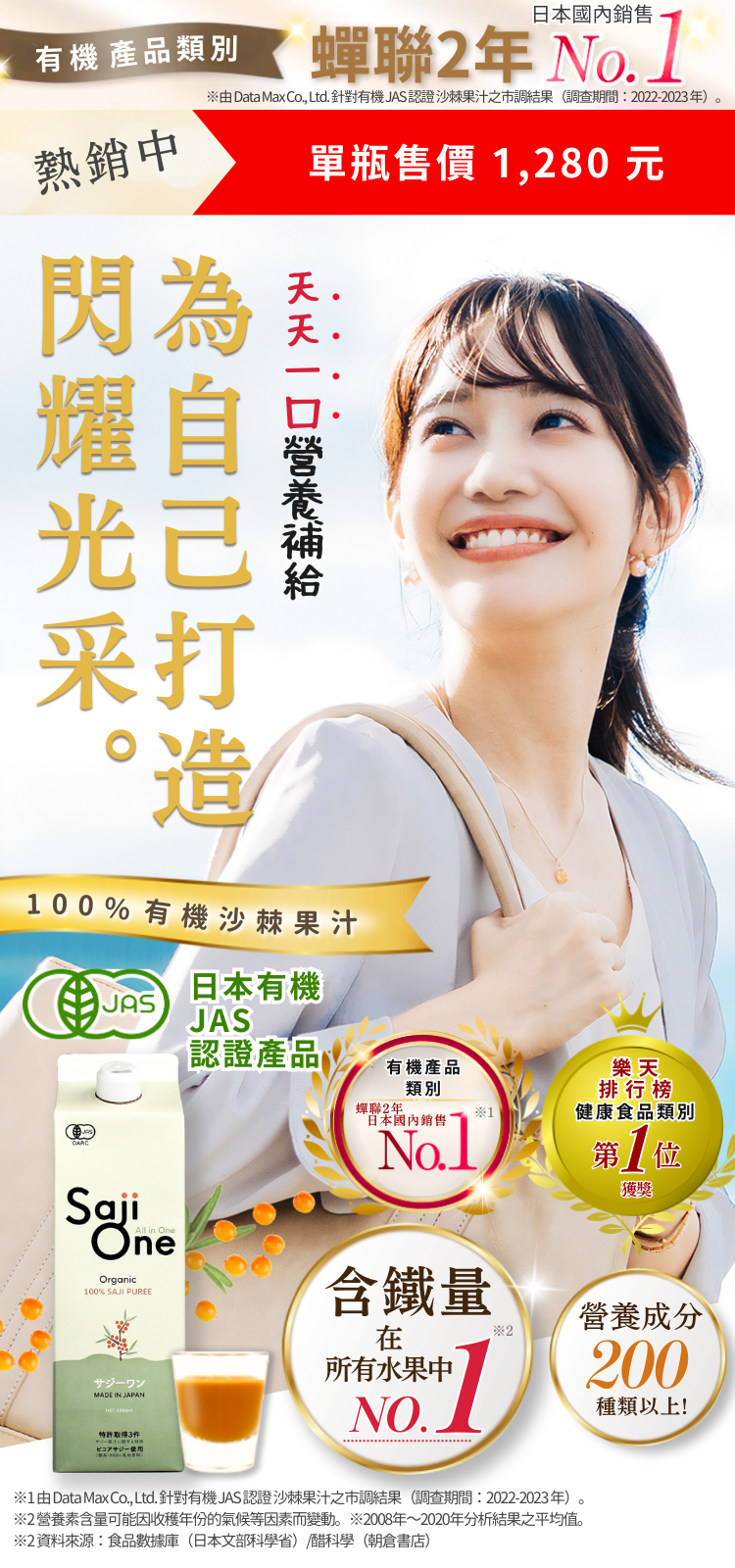 沙棘富含蘋果酸(有機酸),因此具有強烈的酸味和濃郁的口感。SajiOne 是「無添加(※)有機」產品,因此保留了沙棘原有的自然味道。蔬食者和純素食者也可以放心飲用。