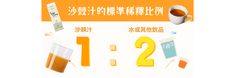 ●建議將沙棘汁以3~4倍比例稀釋後飲用。※以3倍稀釋計算時,果汁含量約為33%。(例如:沙棘汁1:水或其他飲品2~3)